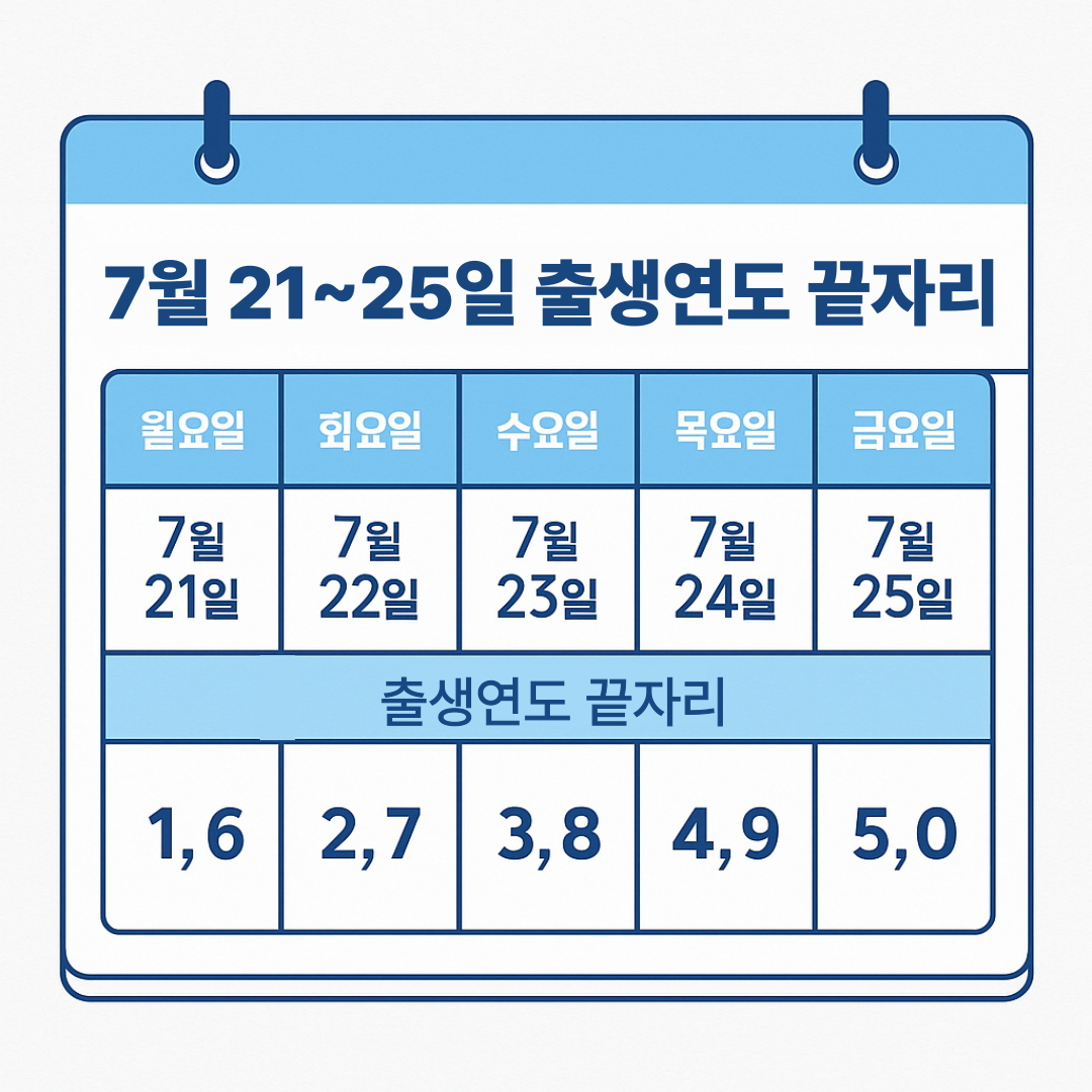 7월 21일부터 25일까지는 출생연도 끝자리에 따른 요일제가 적용됩니다. 혼잡을 피하기 위해 본인의 출생연도 끝자리를 확인하고 해당 요일에 방문해주세요.