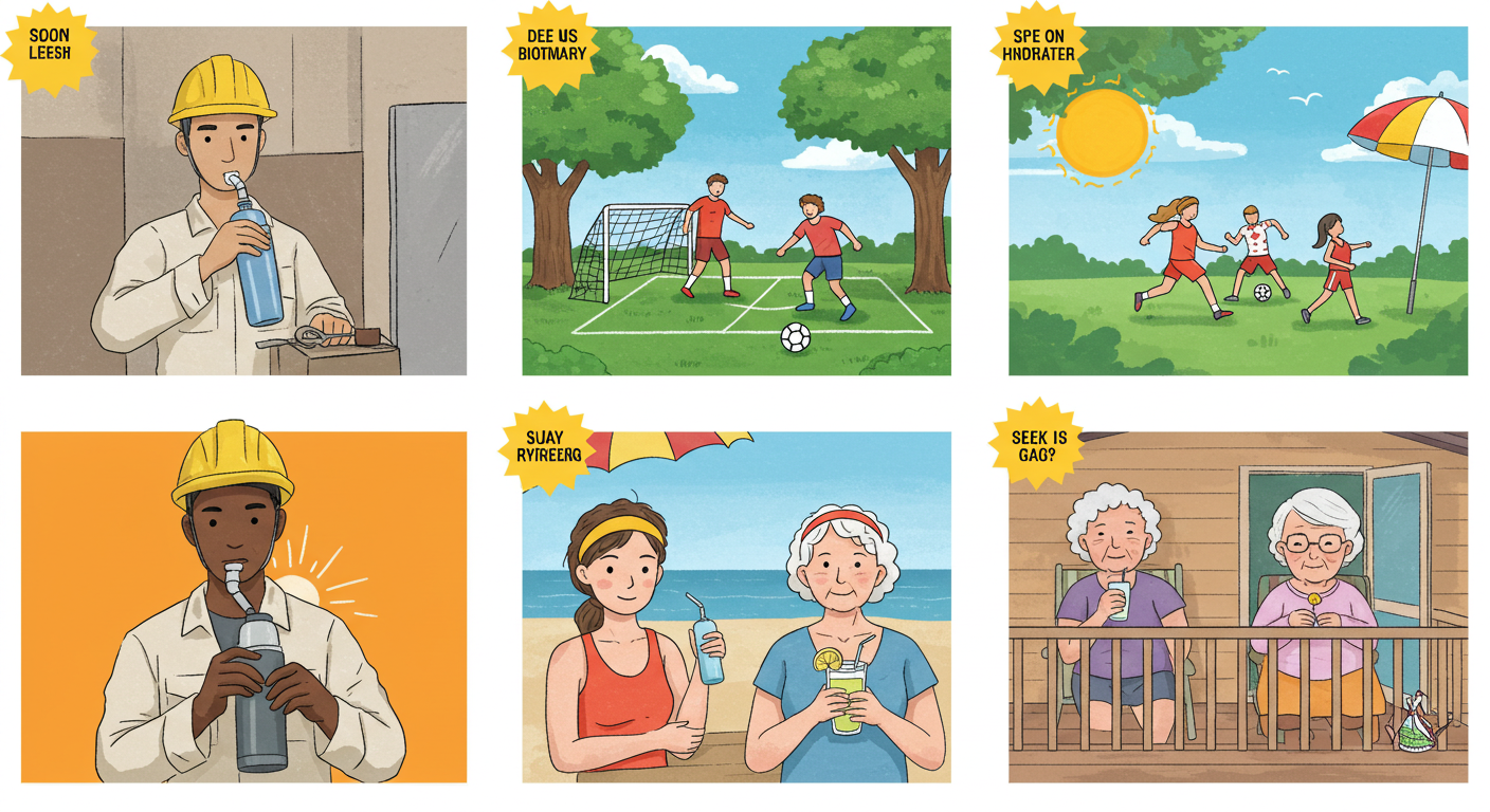 건설 현장 작업자, 농업 종사자, 야외 스포츠 참여자들에게서 흔히 볼 수 있으며, 특히 충분한 수분 섭취 없이 장시간 햇볕에 노출될 때 발생 위험이 높아집니다.